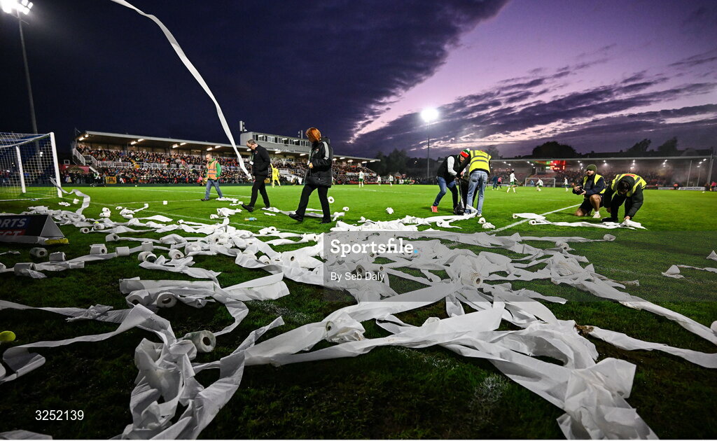 3 October 2025; Toilet roll is thrown on the pitch by Cork City supporters before the Sports Direct Men’s FAI Cup semi-final match between Cork City and St Patrick's Athletic at Turner’s Cross in Cork. Photo by Seb Daly/Sportsfile