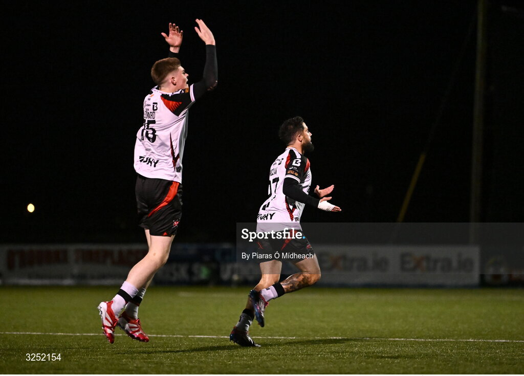 3 October 2025; Declan McDaid of Dundalk, right, celebrates with team-mate Vincent Leonard after scoring their side's first goal during SSE Airtricity Men's First Division match between Athlone Town and Dundalk at Athlone Town Stadium in Westmeath. Photo by Piaras Ó Mídheach/Sportsfile