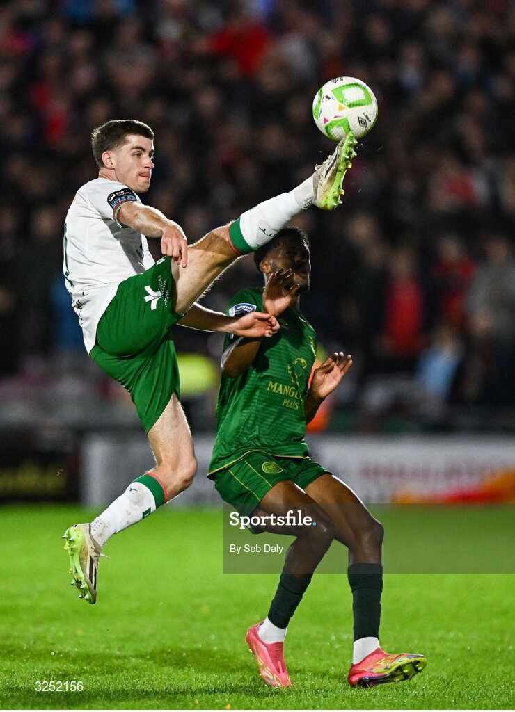 3 October 2025; Darragh Crowley of Cork City in action against Jordan Garrick of St Patrick's Athletic during the Sports Direct Men’s FAI Cup semi-final match between Cork City and St Patrick's Athletic at Turner’s Cross in Cork. Photo by Seb Daly/Sportsfile