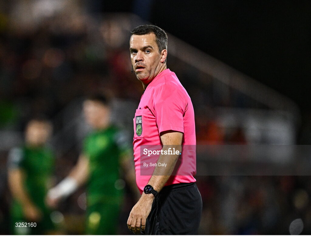 3 October 2025; Referee Robert Harvey during the Sports Direct Men’s FAI Cup semi-final match between Cork City and St Patrick's Athletic at Turner’s Cross in Cork. Photo by Seb Daly/Sportsfile
