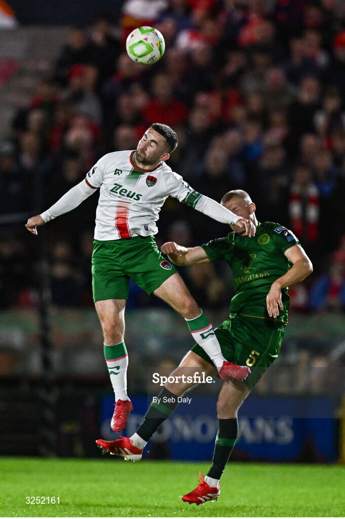 3 October 2025; Sean Maguire of Cork City in action against Tom Grivosti of St Patrick's Athletic during the Sports Direct Men’s FAI Cup semi-final match between Cork City and St Patrick's Athletic at Turner’s Cross in Cork. Photo by Seb Daly/Sportsfile