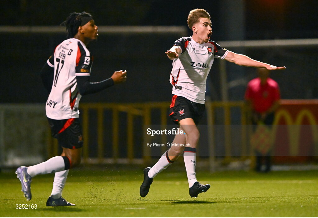 3 October 2025; Eoin Kenny of Dundalk, right, reacts after his first half goal was disallowed during the SSE Airtricity Men's First Division match between Athlone Town and Dundalk at Athlone Town Stadium in Westmeath. Photo by Piaras Ó Mídheach/Sportsfile