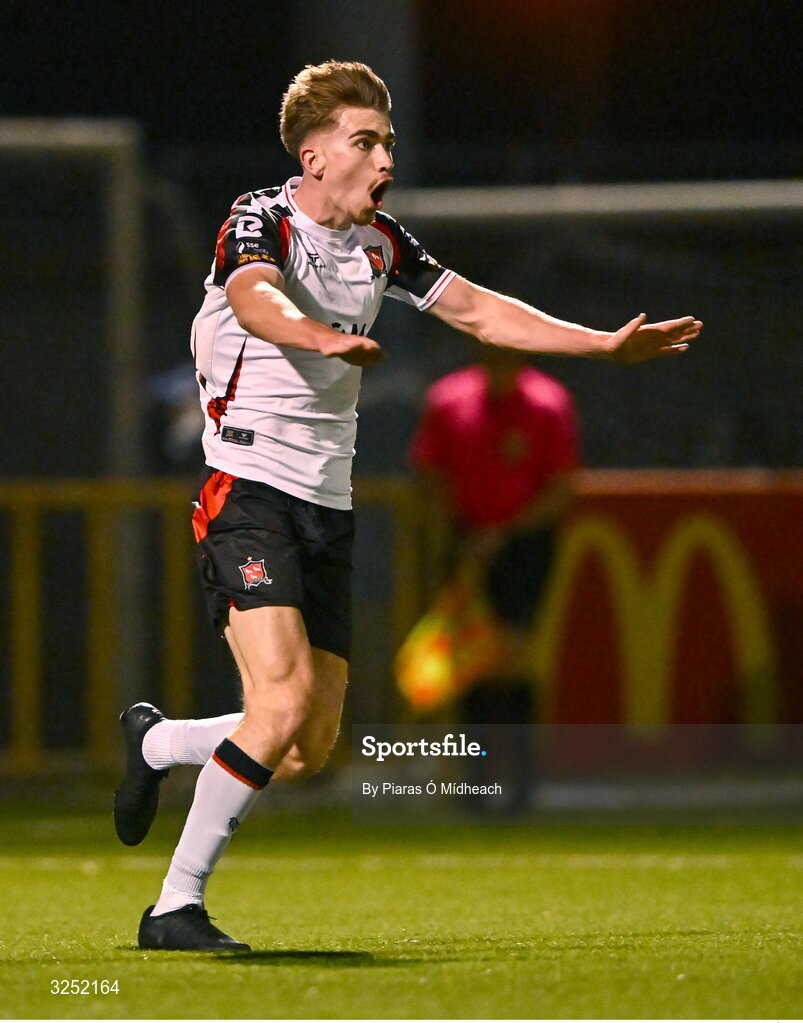 3 October 2025; Eoin Kenny of Dundalk reacts after his first half goal was disallowed during the SSE Airtricity Men's First Division match between Athlone Town and Dundalk at Athlone Town Stadium in Westmeath. Photo by Piaras Ó Mídheach/Sportsfile