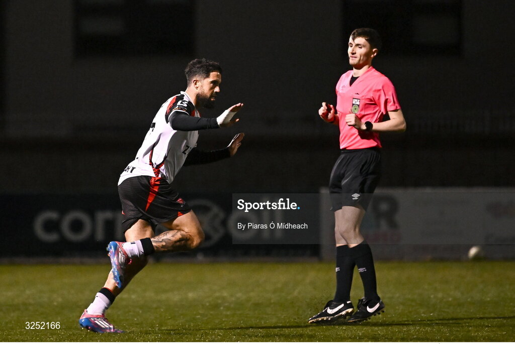 3 October 2025; Declan McDaid of Dundalk celebrates scoring his side's first goal during SSE Airtricity Men's First Division match between Athlone Town and Dundalk at Athlone Town Stadium in Westmeath. Photo by Piaras Ó Mídheach/Sportsfile