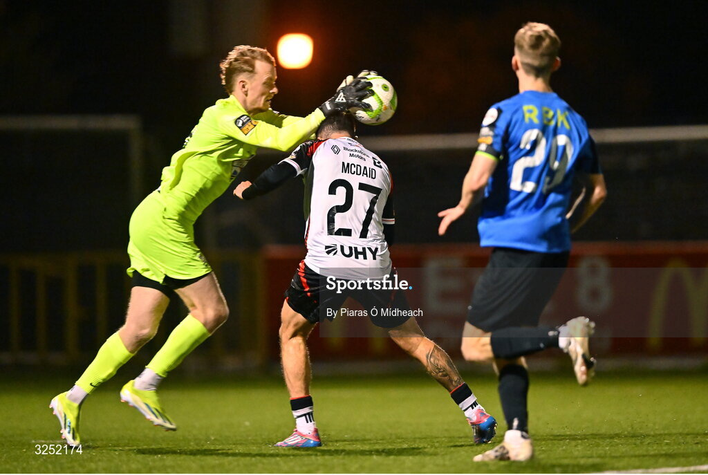 3 October 2025; Athlone Town goalkeeper Andrew Stuart-Trainor claims possession ahead of Declan McDaid of Dundalk during the SSE Airtricity Men's First Division match between Athlone Town and Dundalk at Athlone Town Stadium in Westmeath. Photo by Piaras Ó Mídheach/Sportsfile