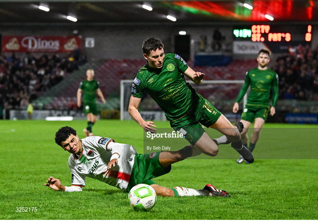 3 October 2025; Kian Leavy of St Patrick's Athletic is tackled by Freddie Anderson of Cork City during the Sports Direct Men’s FAI Cup semi-final match between Cork City and St Patrick's Athletic at Turner’s Cross in Cork. Photo by Seb Daly/Sportsfile