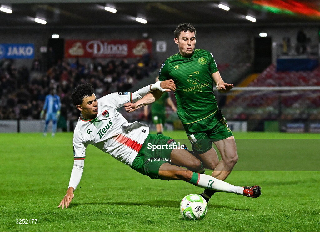 3 October 2025; Kian Leavy of St Patrick's Athletic is tackled by Freddie Anderson of Cork City during the Sports Direct Men’s FAI Cup semi-final match between Cork City and St Patrick's Athletic at Turner’s Cross in Cork. Photo by Seb Daly/Sportsfile