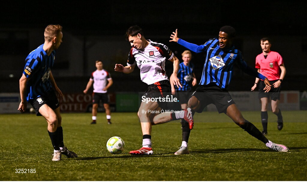 3 October 2025; Shane Tracey of Dundalk in action against Kelende Abdine Jr Thiam of Athlone Town during the SSE Airtricity Men's First Division match between Athlone Town and Dundalk at Athlone Town Stadium in Westmeath. Photo by Piaras Ó Mídheach/Sportsfile
