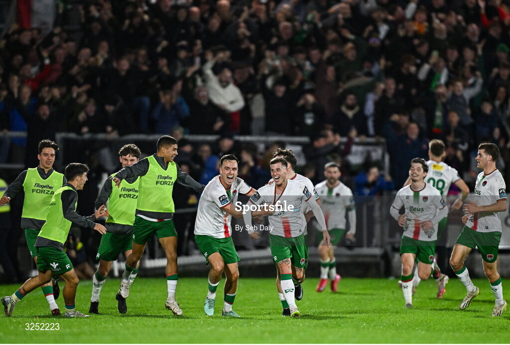 3 October 2025; Evan McLaughlin of Cork City centre, celebrates with teammates after scoring his side's third goal during the Sports Direct Men’s FAI Cup semi-final match between Cork City and St Patrick's Athletic at Turner’s Cross in Cork. Photo by Seb Daly/Sportsfile