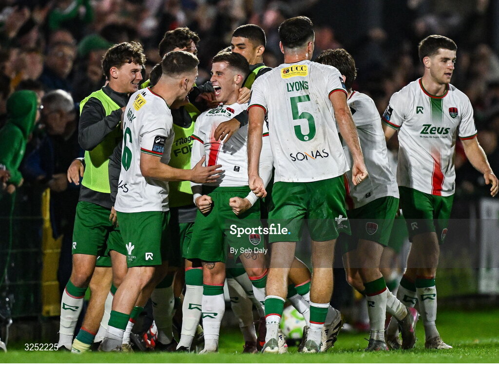3 October 2025; Evan McLaughlin of Cork City centre, celebrates with teammates after scoring his side's third goal during the Sports Direct Men’s FAI Cup semi-final match between Cork City and St Patrick's Athletic at Turner’s Cross in Cork. Photo by Seb Daly/Sportsfile