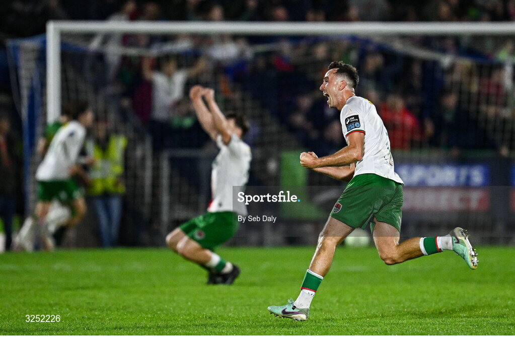 3 October 2025; Charlie Lyons of Cork City celebrates his side's second goal scored by teammate Evan McLaughlin during the Sports Direct Men’s FAI Cup semi-final match between Cork City and St Patrick's Athletic at Turner’s Cross in Cork. Photo by Seb Daly/Sportsfile