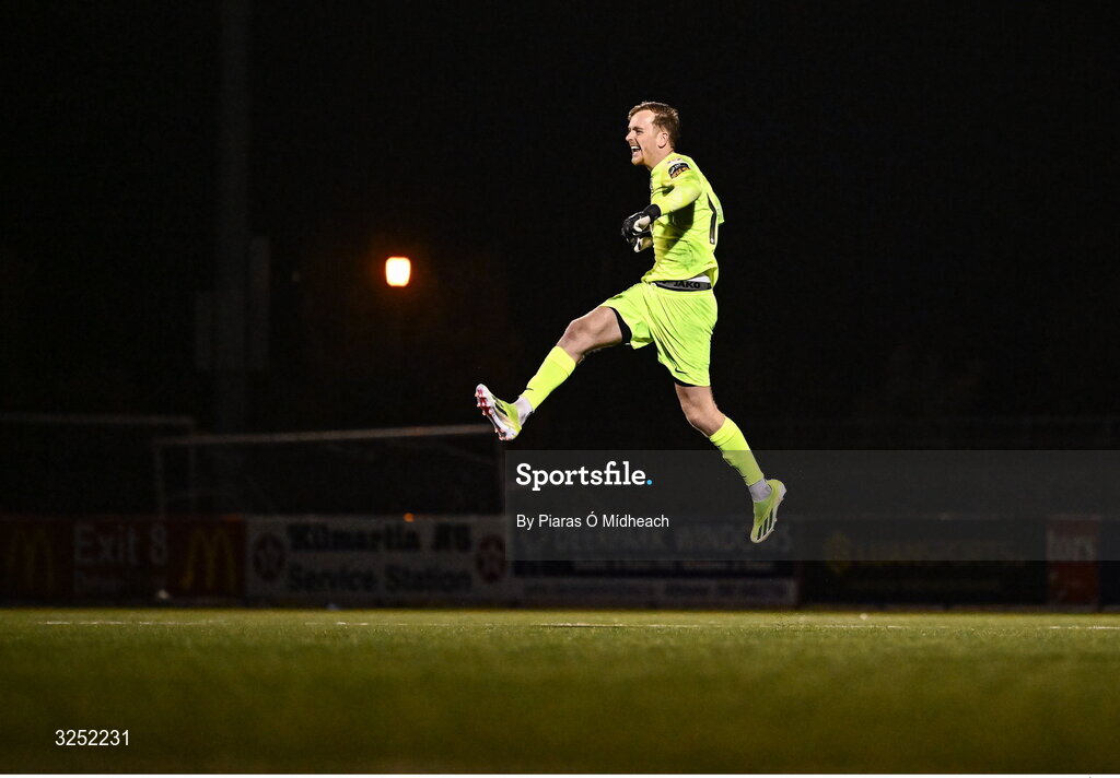 3 October 2025; Athlone Town goalkeeper Andrew Stuart-Trainor celebrates his side's first goal, scored by team-mate Aaron Connolly, not pictured, during the SSE Airtricity Men's First Division match between Athlone Town and Dundalk at Athlone Town Stadium in Westmeath. Photo by Piaras Ó Mídheach/Sportsfile