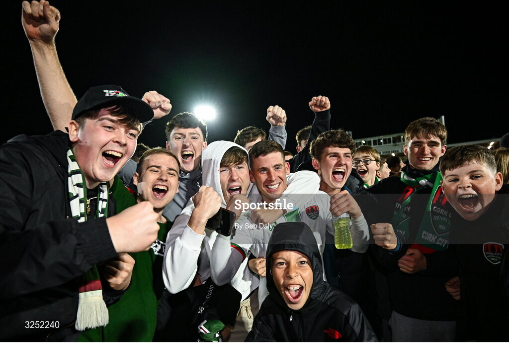 3 October 2025; Evan McLaughlin of Cork City, centre, celebrates with supporters after his side's victory in the Sports Direct Men’s FAI Cup semi-final match between Cork City and St Patrick's Athletic at Turner’s Cross in Cork. Photo by Seb Daly/Sportsfile