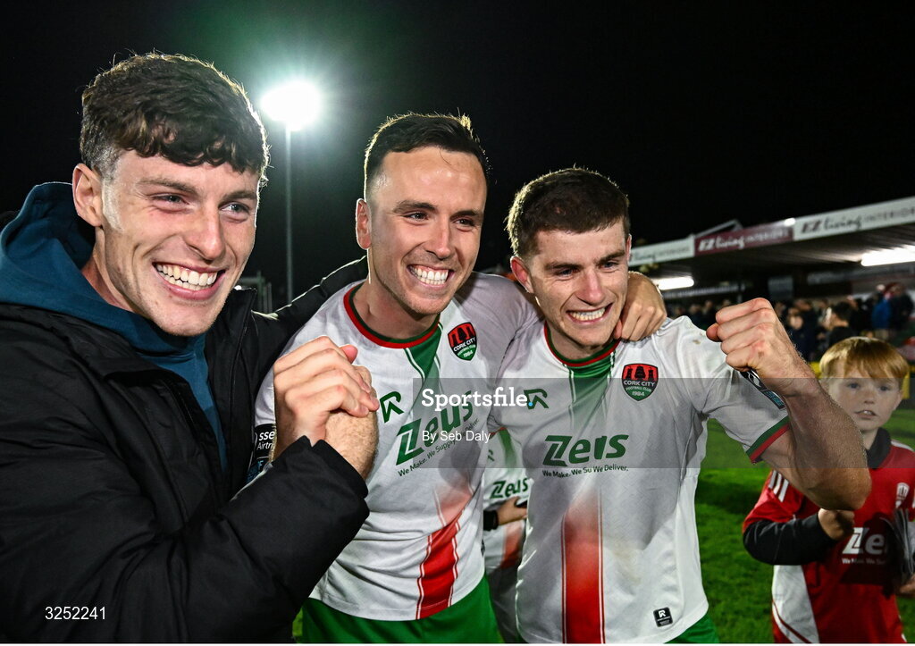 3 October 2025; Cork City players Charlie Lyons, centre, and Darragh Crowley, right, celebrate with supporters after their side's victory in the Sports Direct Men’s FAI Cup semi-final match between Cork City and St Patrick's Athletic at Turner’s Cross in Cork. Photo by Seb Daly/Sportsfile