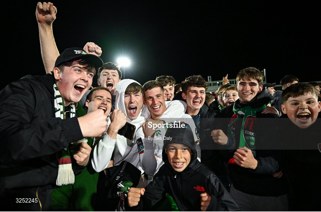 3 October 2025; Evan McLaughlin of Cork City, centre, celebrates with supporters after his side's victory in the Sports Direct Men’s FAI Cup semi-final match between Cork City and St Patrick's Athletic at Turner’s Cross in Cork. Photo by Seb Daly/Sportsfile