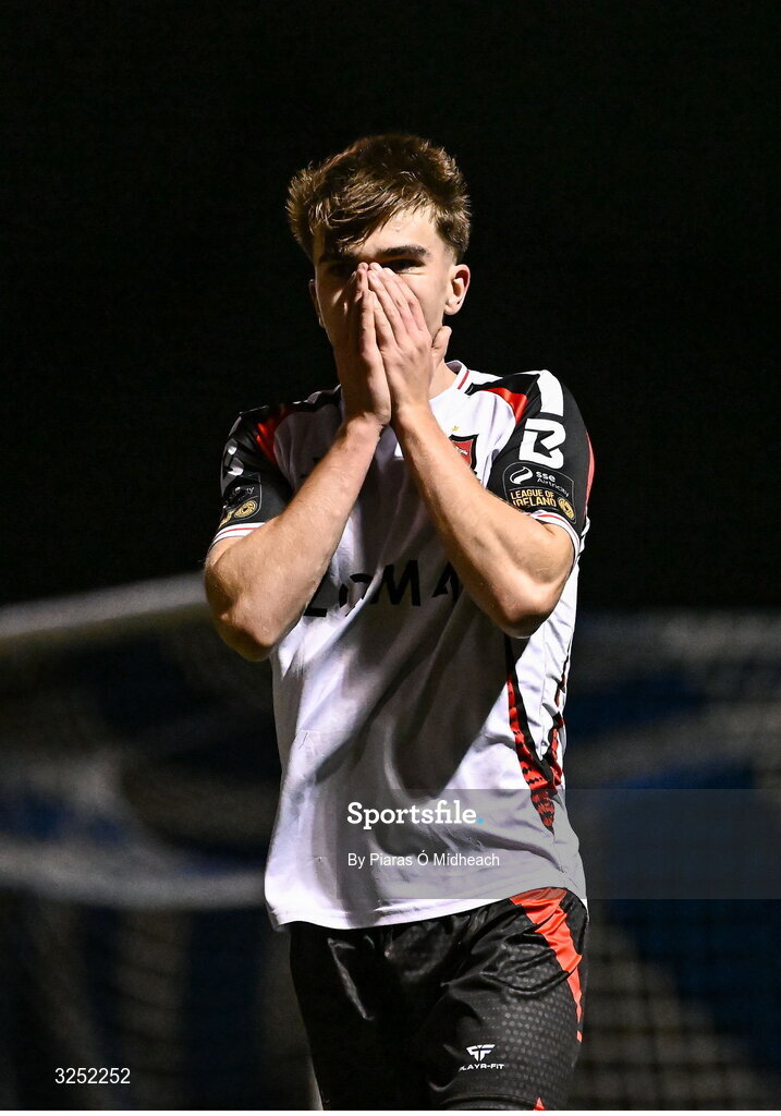 3 October 2025; Eoin Kenny of Dundalk reacts after a missed chance during the SSE Airtricity Men's First Division match between Athlone Town and Dundalk at Athlone Town Stadium in Westmeath. Photo by Piaras Ó Mídheach/Sportsfile