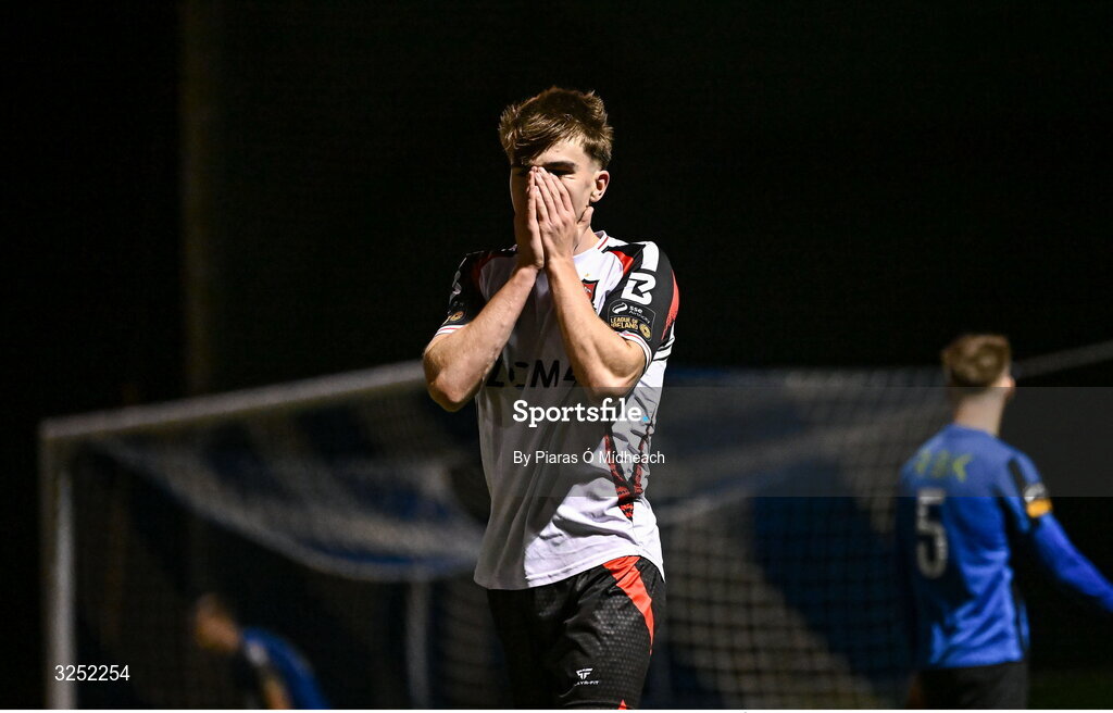 3 October 2025; Eoin Kenny of Dundalk reacts after a missed chance during the SSE Airtricity Men's First Division match between Athlone Town and Dundalk at Athlone Town Stadium in Westmeath. Photo by Piaras Ó Mídheach/Sportsfile