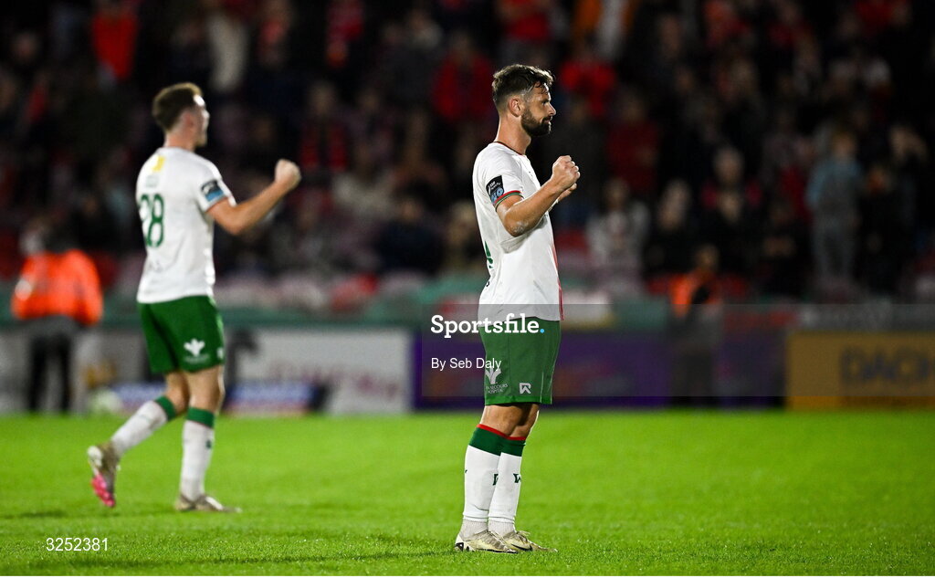 3 October 2025; Cork City players Greg Bolger, right, and Rory Feely celebrate after their side's victory in the Sports Direct Men’s FAI Cup semi-final match between Cork City and St Patrick's Athletic at Turner’s Cross in Cork. Photo by Seb Daly/Sportsfile