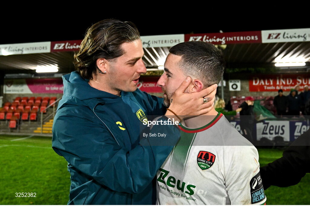 3 October 2025; Sean Maguire of Cork City, right, is congratulated by teammate Ruairí Keating after their side's victory in the Sports Direct Men’s FAI Cup semi-final match between Cork City and St Patrick's Athletic at Turner’s Cross in Cork. Photo by Seb Daly/Sportsfile