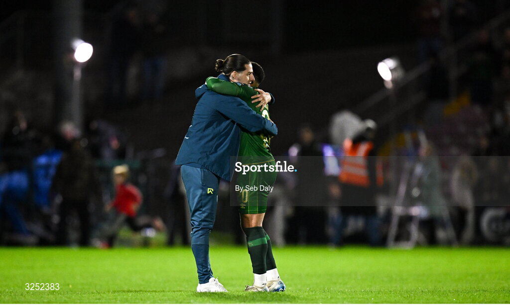3 October 2025; Ruairí Keating of Cork City and Jake Mulraney of St Patrick's Athletic after the Sports Direct Men’s FAI Cup semi-final match between Cork City and St Patrick's Athletic at Turner’s Cross in Cork. Photo by Seb Daly/Sportsfile