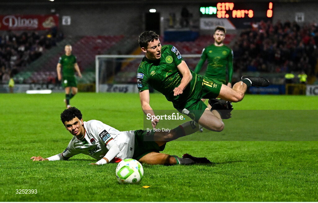 3 October 2025; Kian Leavy of St Patrick's Athletic is tackled by Freddie Anderson of Cork City during the Sports Direct Men’s FAI Cup semi-final match between Cork City and St Patrick's Athletic at Turner’s Cross in Cork. Photo by Seb Daly/Sportsfile