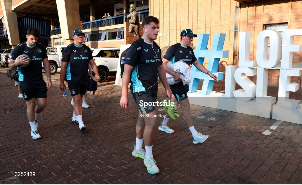 4 October 2025; Leinster players Gus McCarthy, centre, and Charlie Tector, right, arrive alongside teammates before the United Rugby Championship match between Vodacom Bulls and Leinster at Loftus Versfeld Stadium in Pretoria, South Africa. Photo by Shaun Roy/Sportsfile