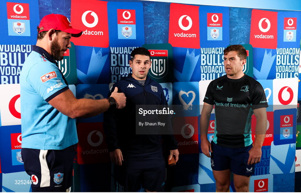 4 October 2025; Referee Adam Jones, centre, with Vodacom Bulls captain Marcell Coetzee, left, and Leinster captain Luke McGrath during the coin toss before the United Rugby Championship match between Vodacom Bulls and Leinster at Loftus Versfeld Stadium in Pretoria, South Africa. Photo by Shaun Roy/Sportsfile