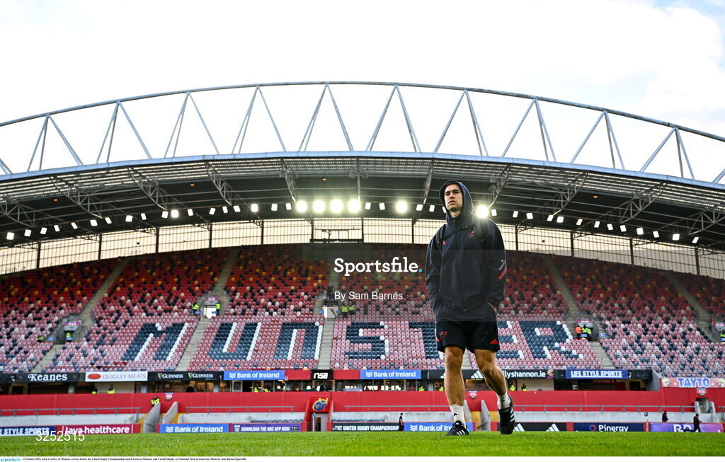 4 October 2025; Jack Crowley of Munster arrives before the United Rugby Championship match between Munster and Cardiff Rugby at Thomond Park in Limerick. Photo by Sam Barnes/Sportsfile