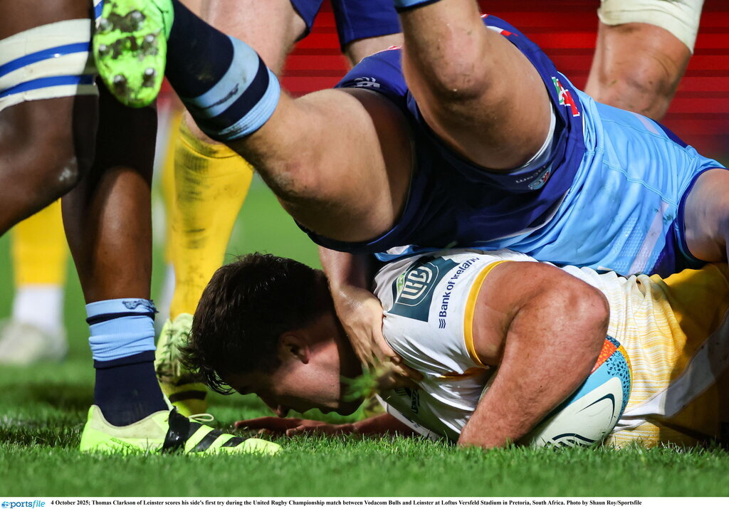 4 October 2025; Thomas Clarkson of Leinster scores his side's first try during the United Rugby Championship match between Vodacom Bulls and Leinster at Loftus Versfeld Stadium in Pretoria, South Africa. Photo by Shaun Roy/Sportsfile