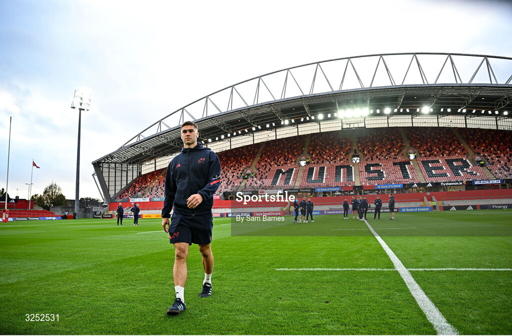 4 October 2025; Jack Crowley of Munster walks the pitch before the United Rugby Championship match between Munster and Cardiff Rugby at Thomond Park in Limerick. Photo by Sam Barnes/Sportsfile