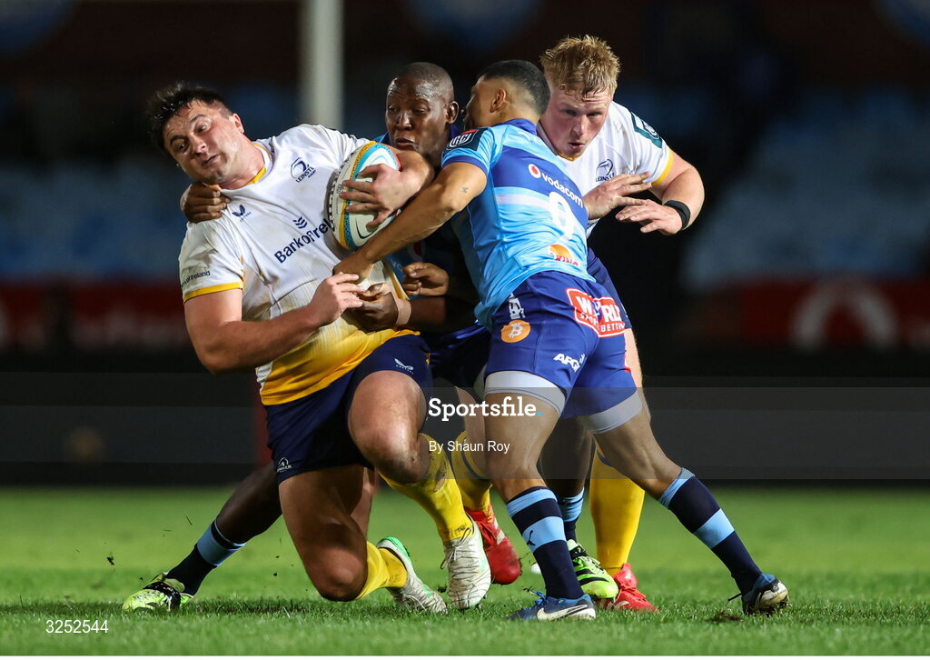 4 October 2025; Thomas Clarkson of Leinster is tackled by Vodacom Bulls players Embrose Papier, right, and Nama Xaba, behind, during the United Rugby Championship match between Vodacom Bulls and Leinster at Loftus Versfeld Stadium in Pretoria, South Africa. Photo by Shaun Roy/Sportsfile