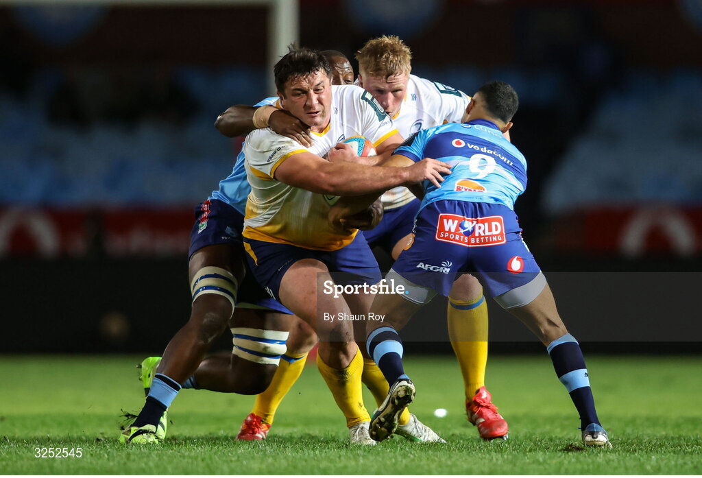 4 October 2025; Thomas Clarkson of Leinster is tackled by Vodacom Bulls players Embrose Papier, right, and Nama Xaba during the United Rugby Championship match between Vodacom Bulls and Leinster at Loftus Versfeld Stadium in Pretoria, South Africa. Photo by Shaun Roy/Sportsfile
