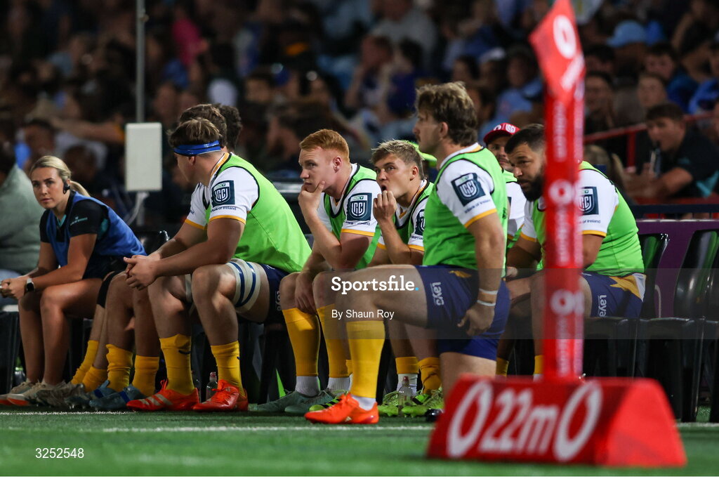 4 October 2025; Leinster players, including Ciarán Frawley and Fintan Gunne, during the United Rugby Championship match between Vodacom Bulls and Leinster at Loftus Versfeld Stadium in Pretoria, South Africa. Photo by Shaun Roy/Sportsfile