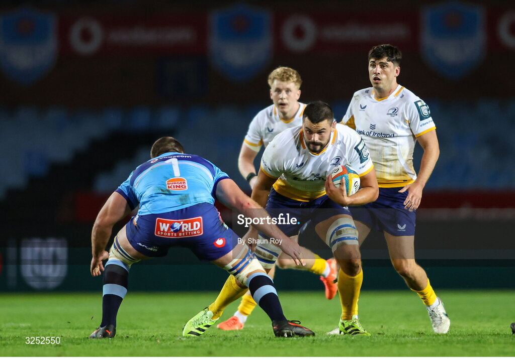 4 October 2025; Max Deegan of Leinster in action against Gerhard Steenekamp of Vodacom Bulls during the United Rugby Championship match between Vodacom Bulls and Leinster at Loftus Versfeld Stadium in Pretoria, South Africa. Photo by Shaun Roy/Sportsfile