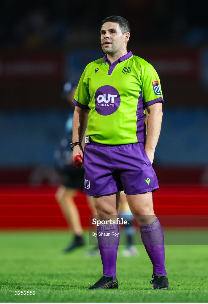 4 October 2025; Referee Adam Jones during the United Rugby Championship match between Vodacom Bulls and Leinster at Loftus Versfeld Stadium in Pretoria, South Africa. Photo by Shaun Roy/Sportsfile