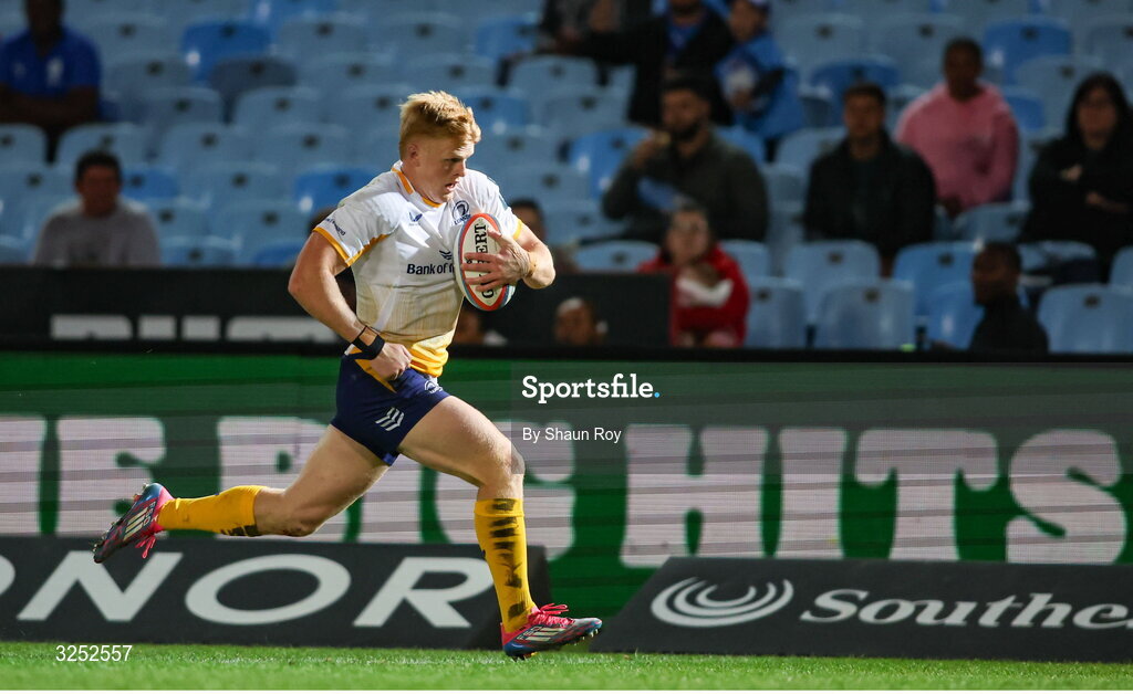 4 October 2025; Tommy O'Brien of Leinster on his way to scoring his side's third try during the United Rugby Championship match between Vodacom Bulls and Leinster at Loftus Versfeld Stadium in Pretoria, South Africa. Photo by Shaun Roy/Sportsfile
