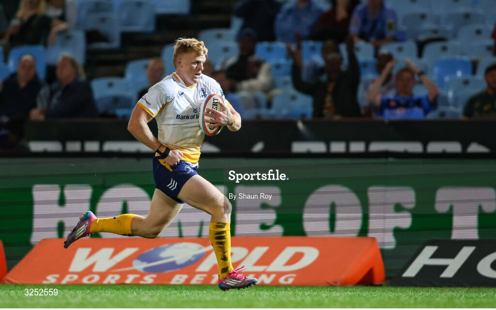 4 October 2025; Tommy O'Brien of Leinster on his way to scoring his side's third try during the United Rugby Championship match between Vodacom Bulls and Leinster at Loftus Versfeld Stadium in Pretoria, South Africa. Photo by Shaun Roy/Sportsfile