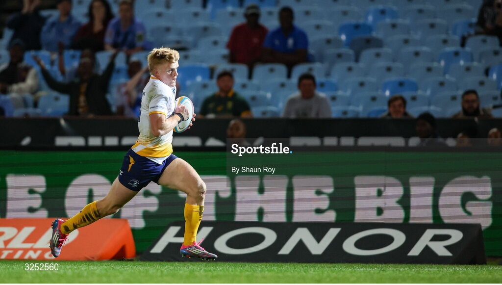 4 October 2025; Tommy O'Brien of Leinster on his way to scoring his side's third try during the United Rugby Championship match between Vodacom Bulls and Leinster at Loftus Versfeld Stadium in Pretoria, South Africa. Photo by Shaun Roy/Sportsfile