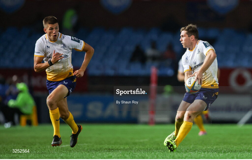 4 October 2025; Luke McGrath of Leinster, right, and teammate Sam Prendergast during the United Rugby Championship match between Vodacom Bulls and Leinster at Loftus Versfeld Stadium in Pretoria, South Africa. Photo by Shaun Roy/Sportsfile