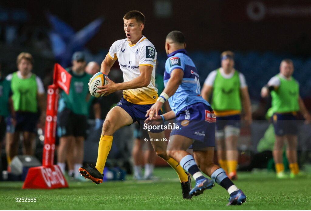 4 October 2025; Sam Prendergast of Leinster in action against Stravino Jacobs of Vodacom Bulls during the United Rugby Championship match between Vodacom Bulls and Leinster at Loftus Versfeld Stadium in Pretoria, South Africa. Photo by Shaun Roy/Sportsfile