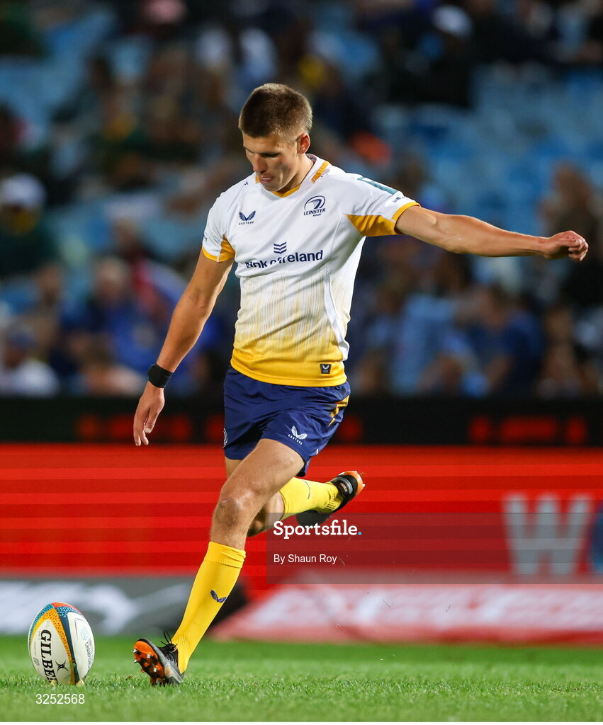 4 October 2025; Sam Prendergast of Leinster kicks a conversion during the United Rugby Championship match between Vodacom Bulls and Leinster at Loftus Versfeld Stadium in Pretoria, South Africa. Photo by Shaun Roy/Sportsfile