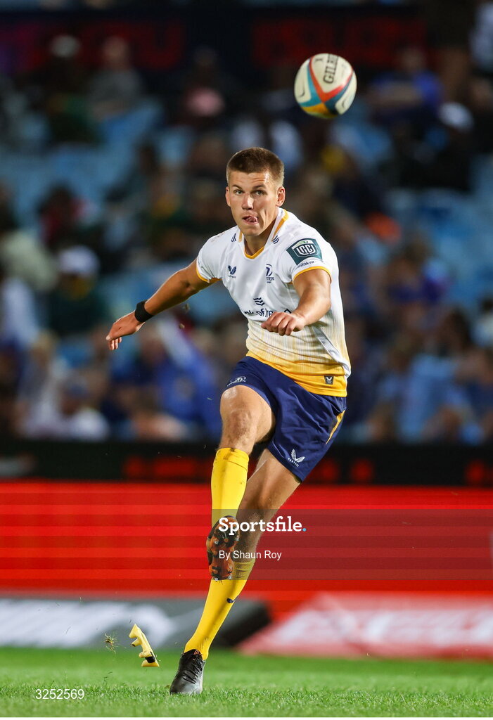 4 October 2025; Sam Prendergast of Leinster kicks a conversion during the United Rugby Championship match between Vodacom Bulls and Leinster at Loftus Versfeld Stadium in Pretoria, South Africa. Photo by Shaun Roy/Sportsfile