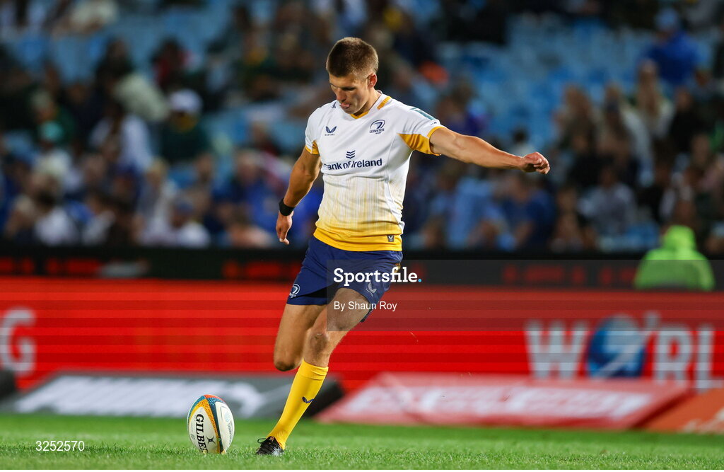4 October 2025; Sam Prendergast of Leinster kicks a conversion during the United Rugby Championship match between Vodacom Bulls and Leinster at Loftus Versfeld Stadium in Pretoria, South Africa. Photo by Shaun Roy/Sportsfile