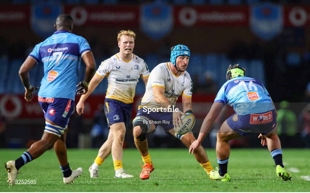 4 October 2025; Will Connors of Leinster in action against Juann Else of Vodacom Bulls during the United Rugby Championship match between Vodacom Bulls and Leinster at Loftus Versfeld Stadium in Pretoria, South Africa. Photo by Shaun Roy/Sportsfile