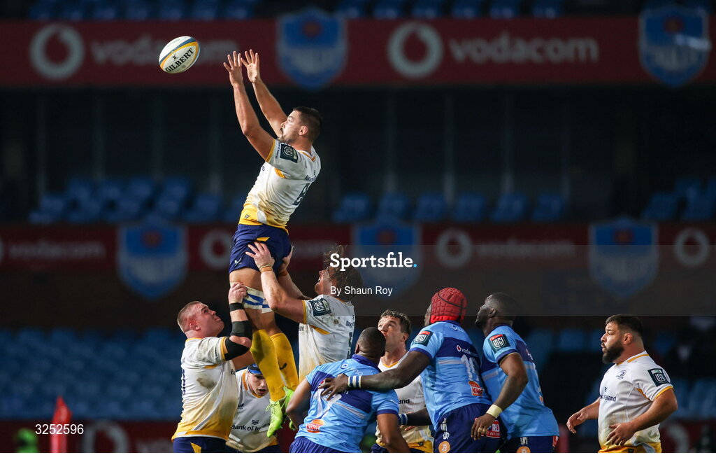 4 October 2025; Max Deegan of Leinster takes possession in a lineout during the United Rugby Championship match between Vodacom Bulls and Leinster at Loftus Versfeld Stadium in Pretoria, South Africa. Photo by Shaun Roy/Sportsfile