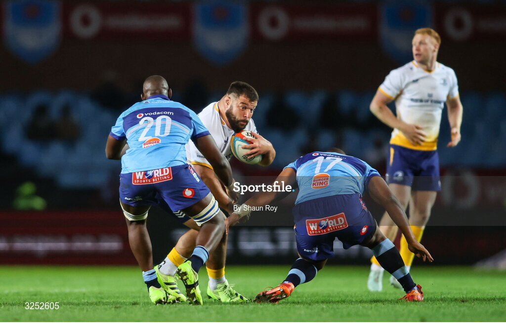 4 October 2025; Rabah Slimani of Leinster in action against Nama Xaba, left, and Alulutho Tshakweni of Vodacom Bulls during the United Rugby Championship match between Vodacom Bulls and Leinster at Loftus Versfeld Stadium in Pretoria, South Africa. Photo by Shaun Roy/Sportsfile
