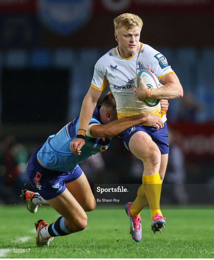 4 October 2025; Tommy O’Brien of Leinster is tackled by David Kriel of Vodacom Bulls during the United Rugby Championship match between Vodacom Bulls and Leinster at Loftus Versfeld Stadium in Pretoria, South Africa. Photo by Shaun Roy/Sportsfile