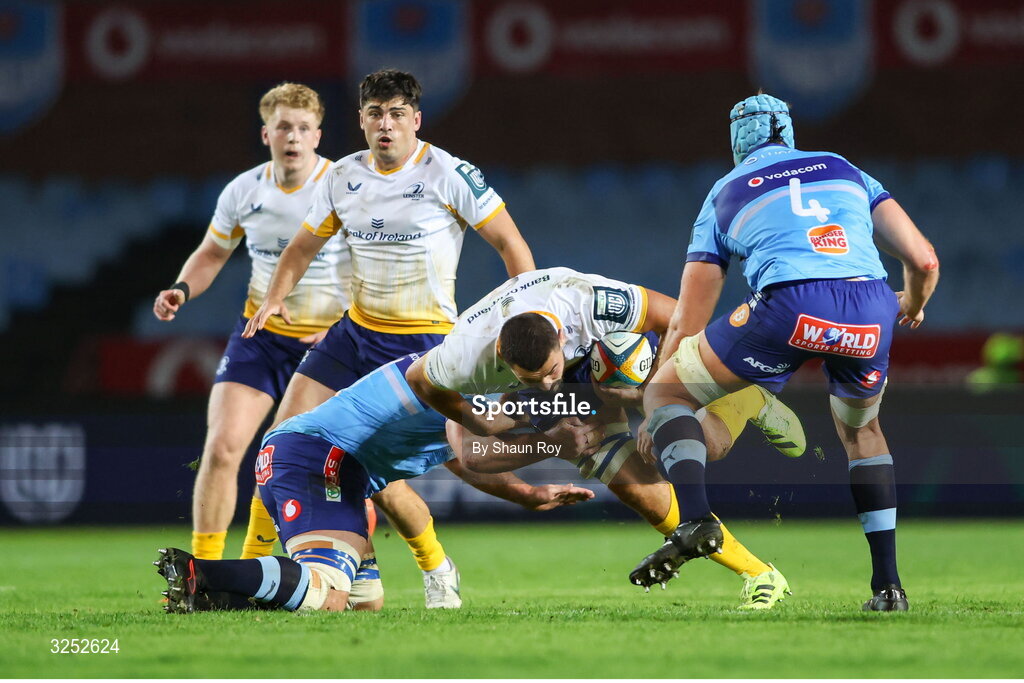4 October 2025; Max Deegan of Leinster in action against Nicolaas Janse van Rensburg of Vodacom Bulls during the United Rugby Championship match between Vodacom Bulls and Leinster at Loftus Versfeld Stadium in Pretoria, South Africa. Photo by Shaun Roy/Sportsfile