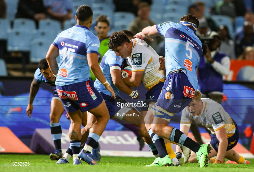 4 October 2025; Jimmy O'Brien of Leinster in action against JF van Heerden of Vodacom Bulls during the United Rugby Championship match between Vodacom Bulls and Leinster at Loftus Versfeld Stadium in Pretoria, South Africa. Photo by Shaun Roy/Sportsfile