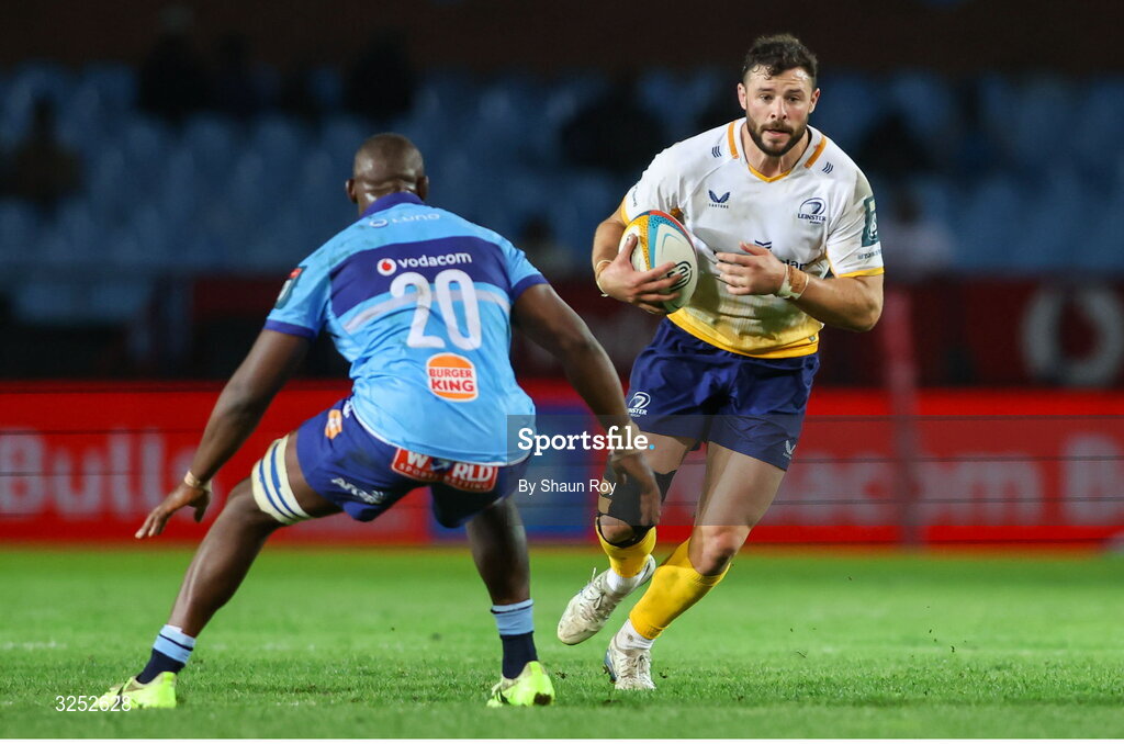 4 October 2025; Robbie Henshaw of Leinster in action against Nama Xaba of Vodacom Bulls during the United Rugby Championship match between Vodacom Bulls and Leinster at Loftus Versfeld Stadium in Pretoria, South Africa. Photo by Shaun Roy/Sportsfile